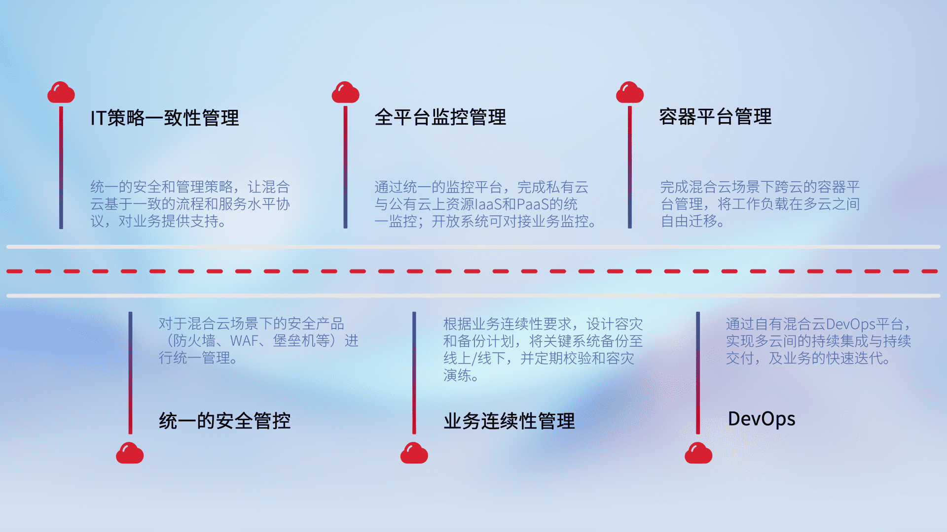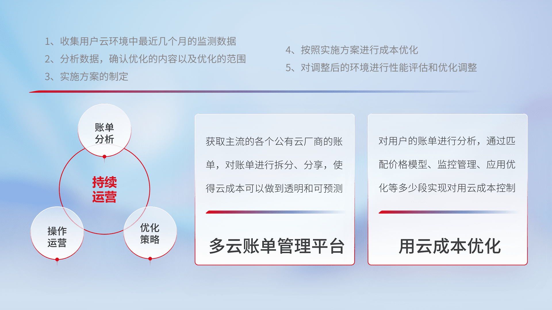 通过多云纳管,,,,以统一的资源数据模型把客户的云资源进行抽象和封装,,,进而实现对多云资源的统一操作,,,保障云资源管理的可靠性、、稳定性与可用性。。。量身定制化运维内容,,,,配置、、、、开发运维、、、、补丁管理、、、备份、、、监控、、认证和访问管理、、审计和日常巡检等,,,,保障在用云过程中的可靠度,,,稳定度以及高可用率。。。